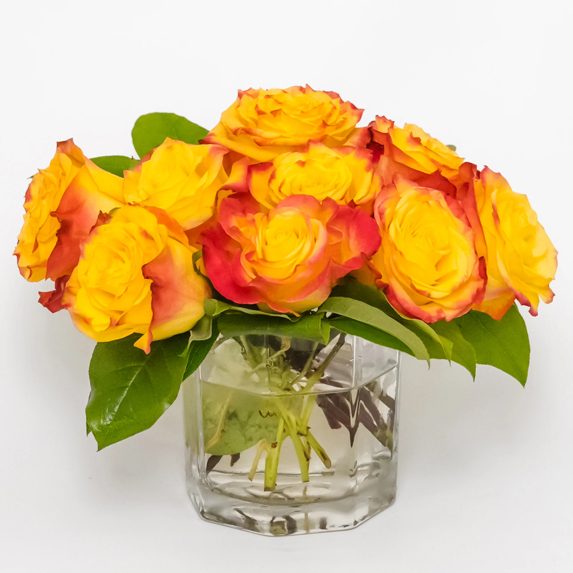 Yellow & Orange Rose Arrangement – Sahara Sunrise features radiant yellow roses kissed with warm orange edges, arranged low and full in a clear glass cube with fresh greenery. Inspired by desert light at dawn, this compact rose design delivers bold color and warmth in a modern, effortless silhouette. Perfect for birthdays, congratulations, or bright everyday moments. Designed and delivered from our Downtown Los Angeles flower shop, with same-day delivery available when possible.