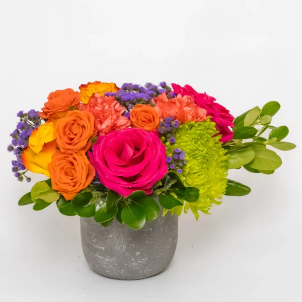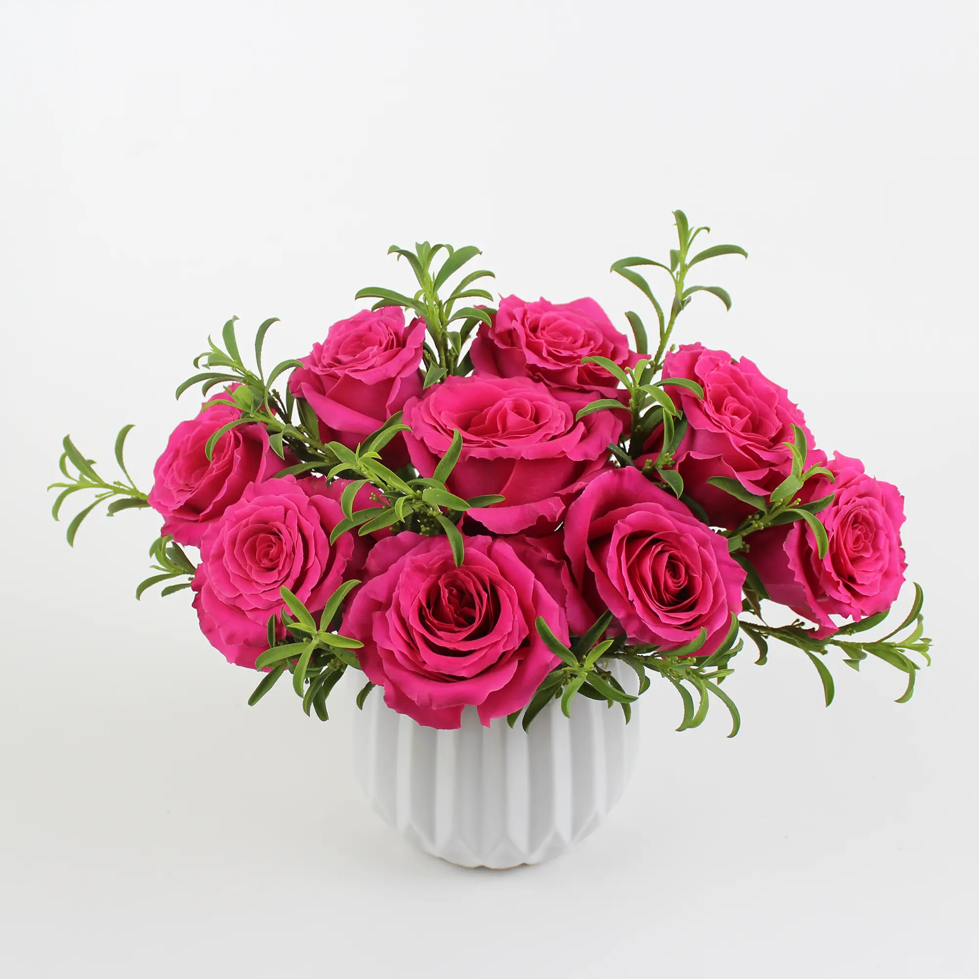 Turn up the color with Miami Heatwave — bold hot pink roses and lush greenery in a chic white vase, inspired by the vibrant energy of South Beach. Perfect for celebrations, love, and good vibes only.
